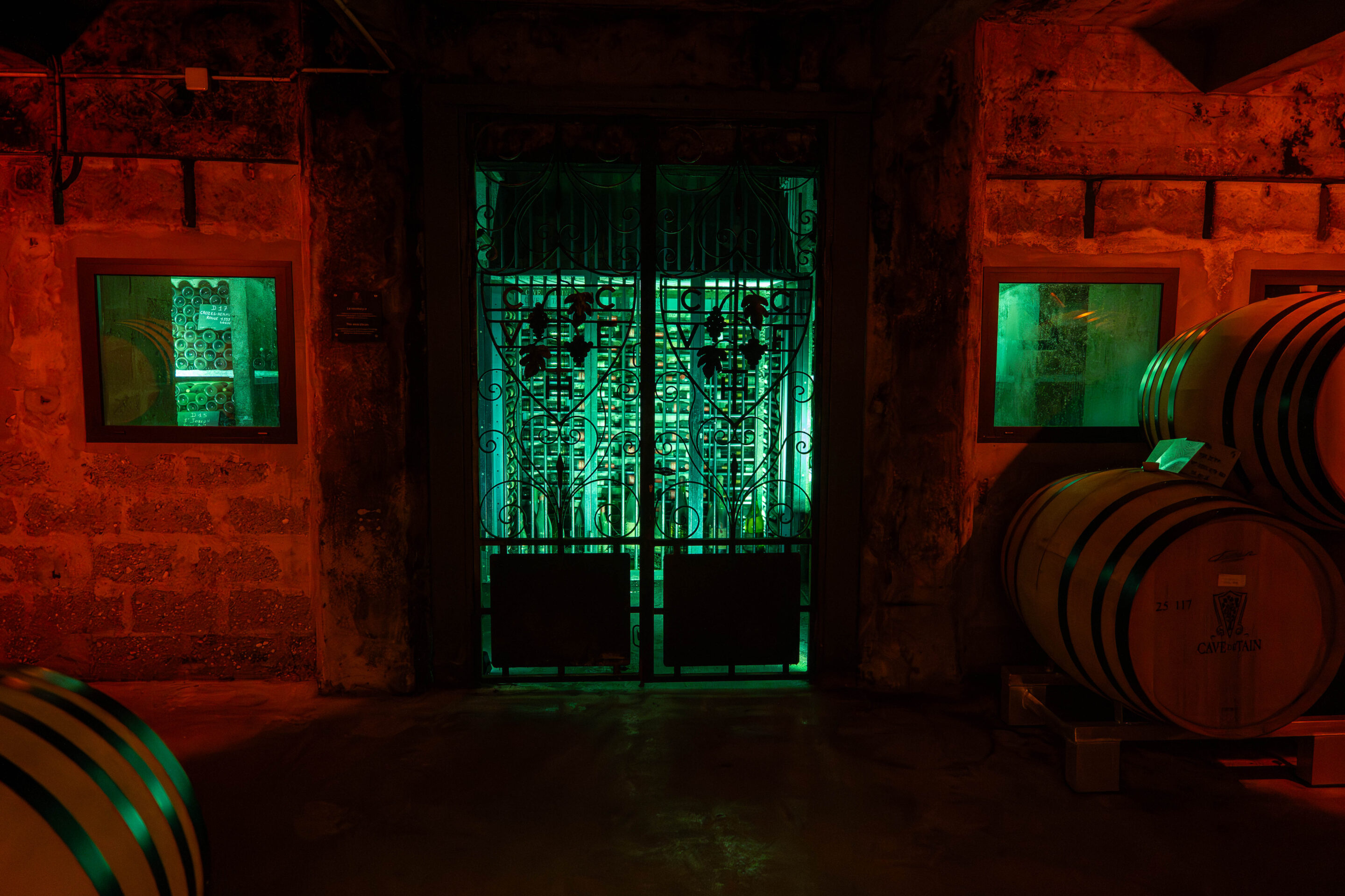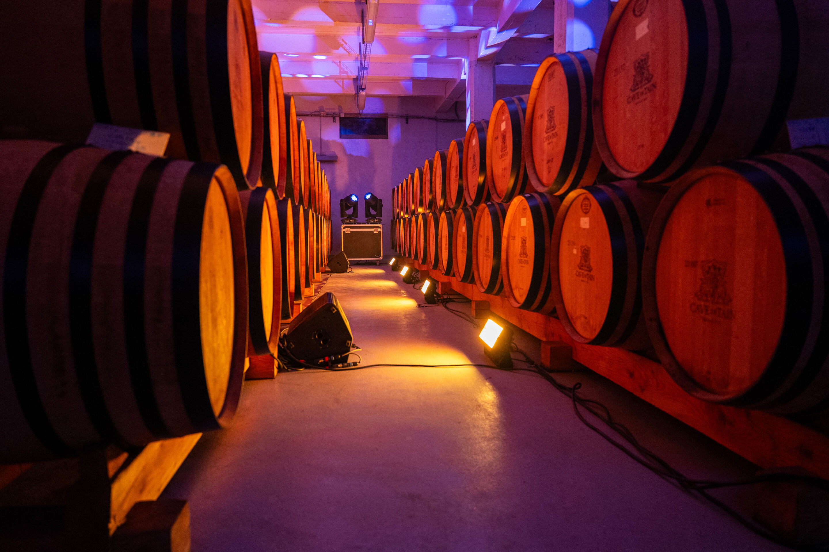 Pour la Cave de Tain, nous avons conçu un parcours immersif événementiel à travers plusieurs espaces : ambiances sonores et lumineuses dédiées aux vins blancs et rouges, projections valorisant les vignerons, et un show son & lumière synchronisé racontant l’histoire de la cave dans sa partie la plus ancienne.
